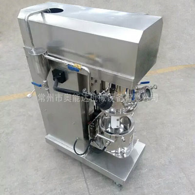 行星分散混合機有高速、低速、活動刮板作攪拌、剪切、刮壁、溶解用。低速運轉的攪拌錨使物料在密閉容器內上下翻動、剪切和混合,高速運轉的齒形分散盤與混合的物料產生強烈的碰擊和剪切,隨著攪拌錨的旋轉,行星架上的活動刮刀隨著旋轉,把釜體上的物料完全刮掉,使聚集物完全、徹底地達到混合、分散、溶解的要求。在其高低速的不同作用下,使物料能夠達到均勻的混合和分散。